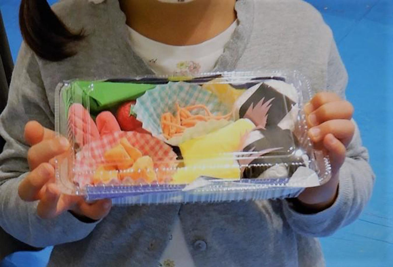 紙粘土でおむすびや卵焼き、プチトマトなどのおかずをつくります。箱につめたら、かわいいペーパーナプキン、フォークをそえて完成です。お家でピクニック気分を楽しんでね。